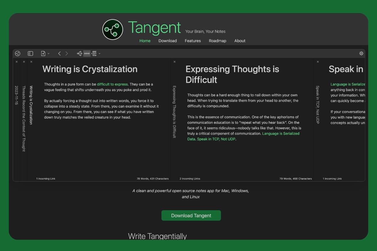 Tangent Notes takes a different approach. Notes flow in threads. One note branches into another. Then another. Sliding panels show the path between ideas.